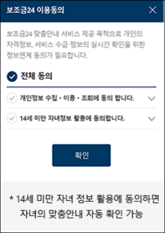 3. 보조금24 이용동의에 전체동의 체크후 확인버튼을 눌러주세요.